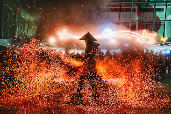SM重慶采用精湛的技藝制作魚燈,由文化傳承人穿著漢服、手執(zhí)魚燈定時巡游,送去年年有“魚”、富足有“魚”的祈福之光;邀約火壺技藝傳承人,在璀璨的夜空下,以火為墨,颯颯英姿、威風八面地繪制出一幅幅動人心魄的光影圖騰,祈愿火除邪祟,百家安寧。