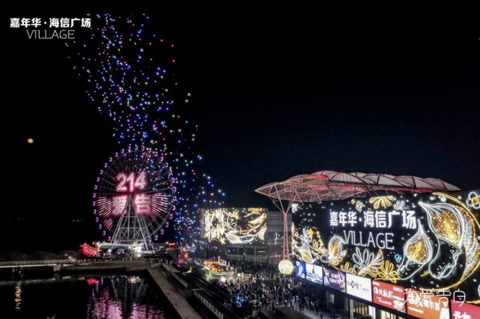 以天為幕,以海為景,千架無人機(jī)璀璨星河秀與流光溢彩的摩天輪燈光秀、絢爛奪目的裸眼3D大屏交相輝映,將情人節(jié)的夜空點(diǎn)綴得如詩如畫。