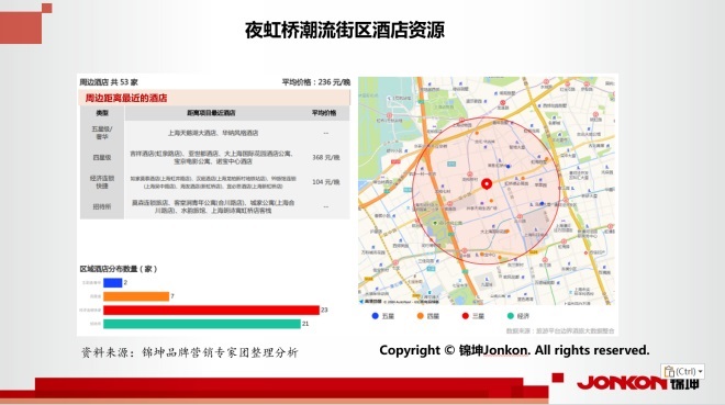 夜虹橋潮流街區(qū)周邊2千米范圍內酒店資源極為豐富。這里總計有53家酒店,其中包括2家五星級酒店,其設施豪華,服務優(yōu)質,能為高端商務人士和游客提供舒適的住宿體驗。此外,還有7家四星級酒店,在硬件設施和服務水平上也有較高的水準。經濟快捷型酒店則有23家,滿足了不同消費者的需求。這些豐富的酒店資源為該區(qū)域帶來了大量的旅游和商務客群資源。