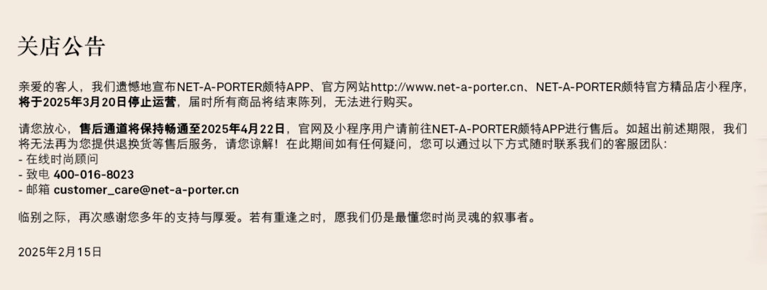 2月15日,NET-A-PORTER中國在官網(wǎng)發(fā)布公告稱,NET-A-PORTER頗特APP、官方網(wǎng)站以及NET-A-PORTER頗特官方精品店小程序,將于2025年3月20日停止運營,屆時所有商品將結(jié)束陳列,無法進行購買。