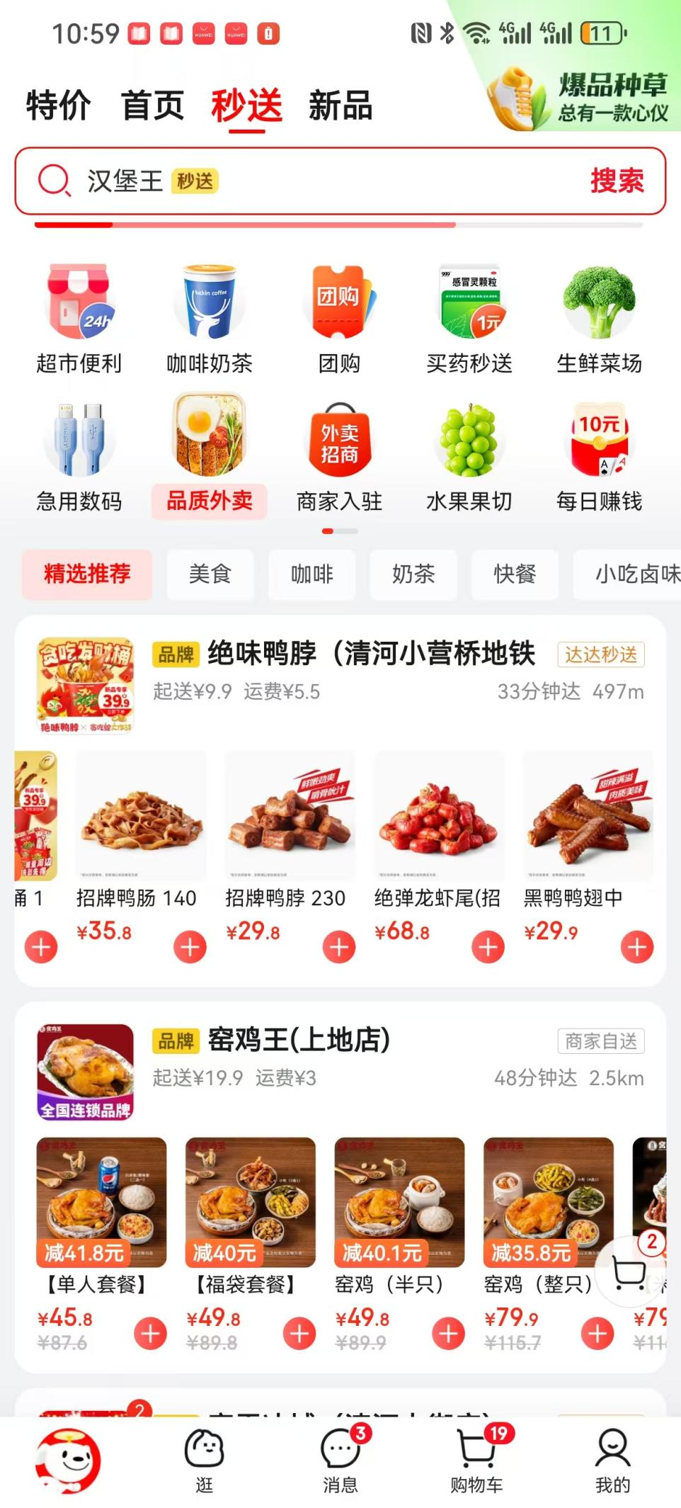 雷達財經(jīng)體驗發(fā)現(xiàn),目前京東外賣內(nèi)嵌在京東App內(nèi),在頂端點擊“秒送”后,即可看到外賣專區(qū),此外,“秒送”還涵蓋咖啡奶茶、買藥秒送、生鮮菜場、急用數(shù)碼、水果果切等類目。