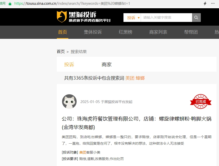 今年2月16日,雷達財經(jīng)以“美團+蟑螂”為關(guān)鍵詞,在黑貓投訴上搜索出3365條結(jié)果。