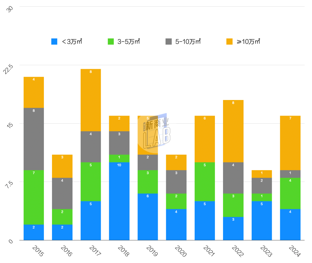 項(xiàng)目體量,去年新開項(xiàng)目總體量達(dá)152.7萬(wàn)㎡,遠(yuǎn)超2023年的51萬(wàn)㎡,次于2022年的222.9萬(wàn)㎡,也是2015年之后的「歷史第三高體量」。