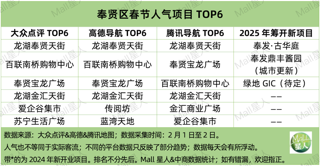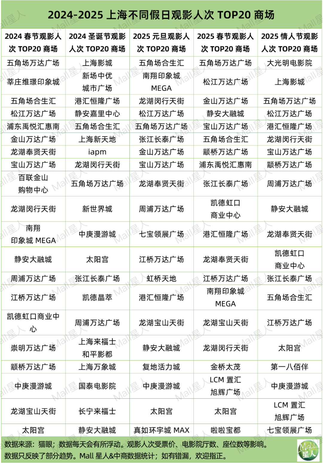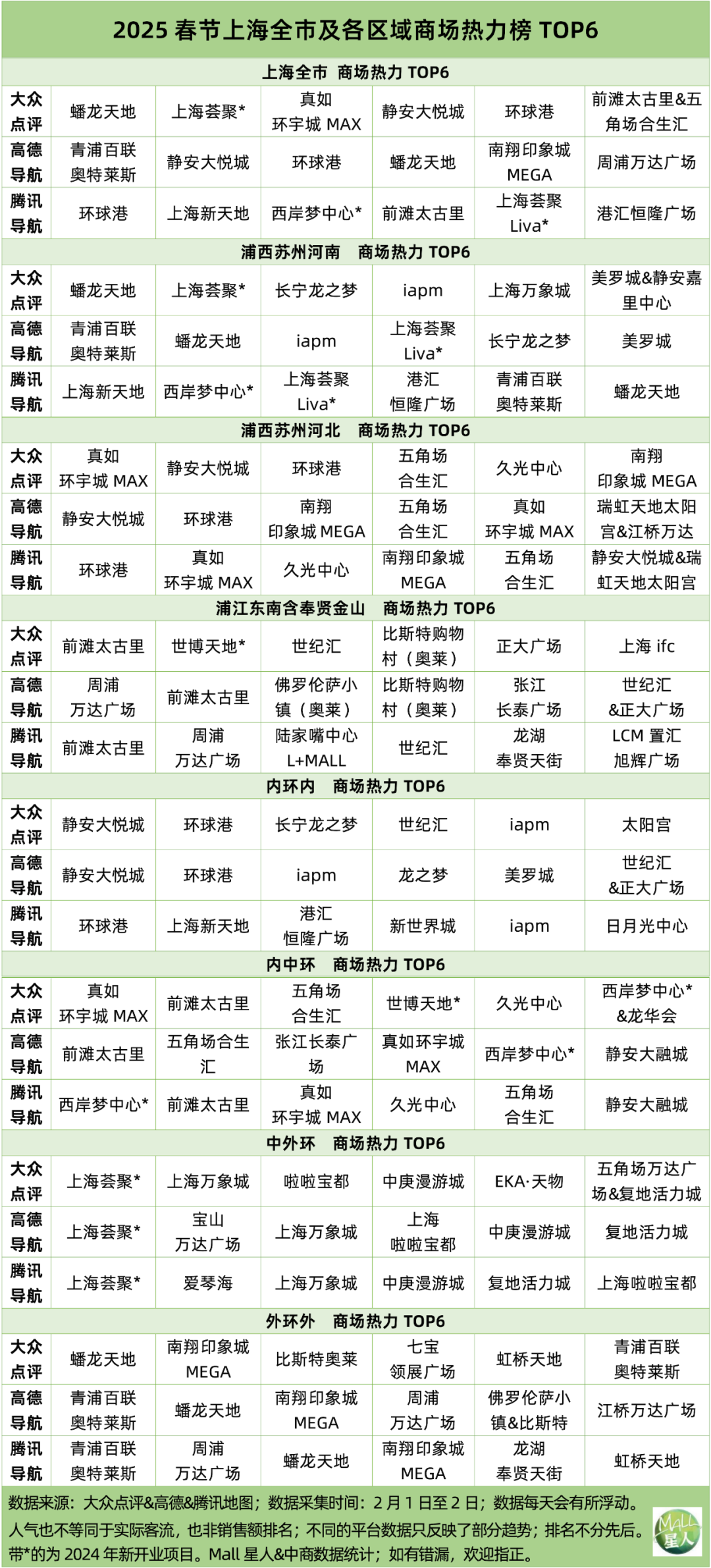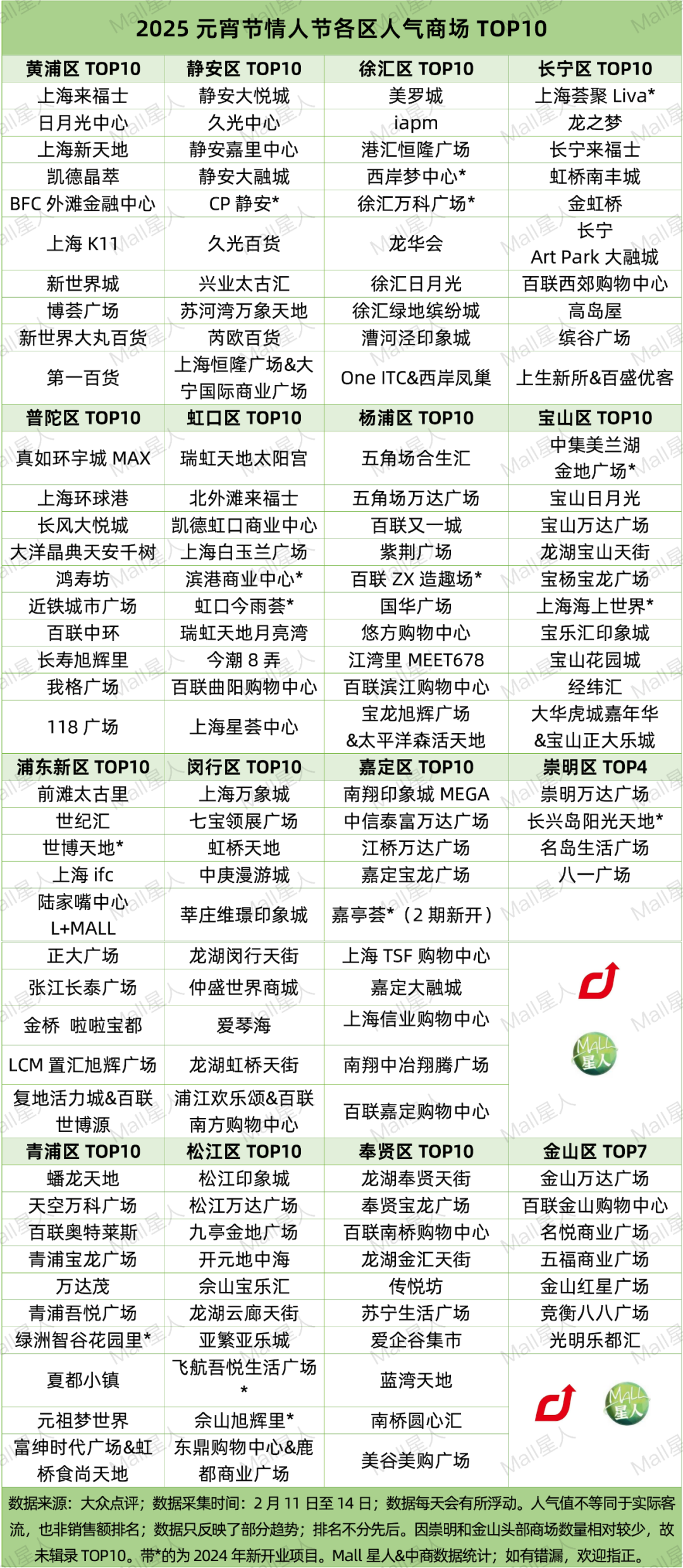 再看看元宵節(jié)情人節(jié)期間各區(qū)人氣商場(chǎng)TOP10的名單匯總,可以跟第二大部分內(nèi)容——各區(qū)春節(jié)期間的頭部名單對(duì)照閱讀。