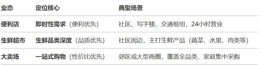 若把大賣場(chǎng)、商超、便利店放在一起,可以看出在起初定位時(shí)是有明顯差異的:
