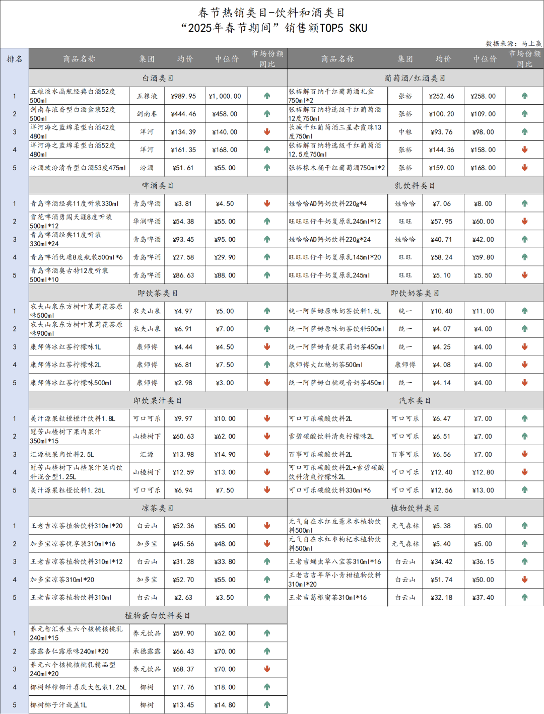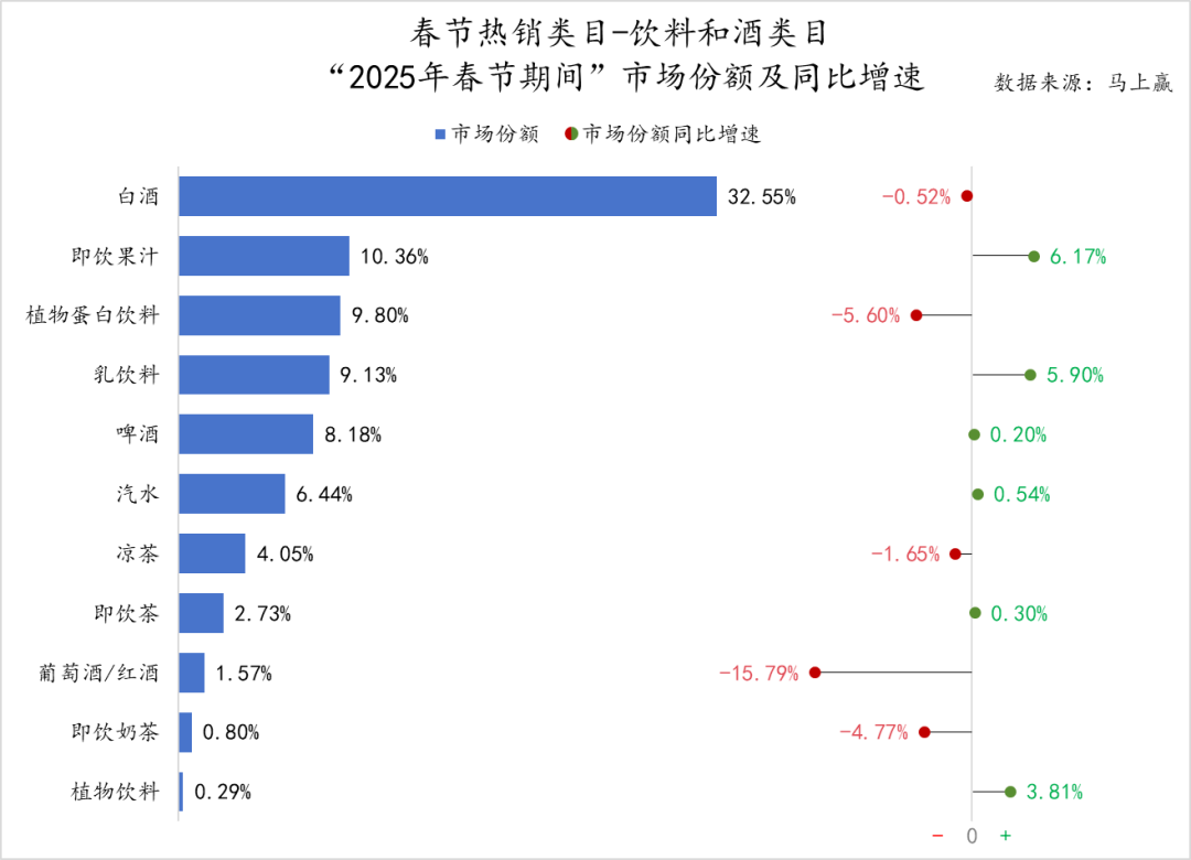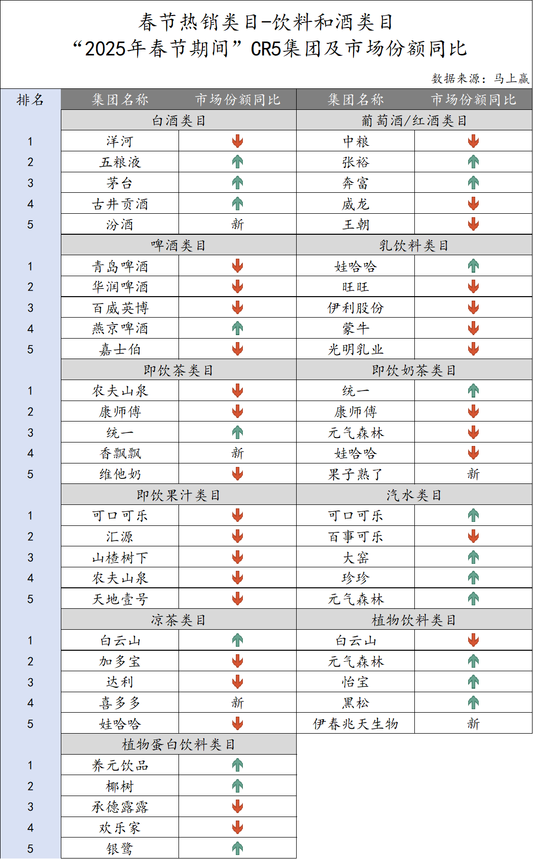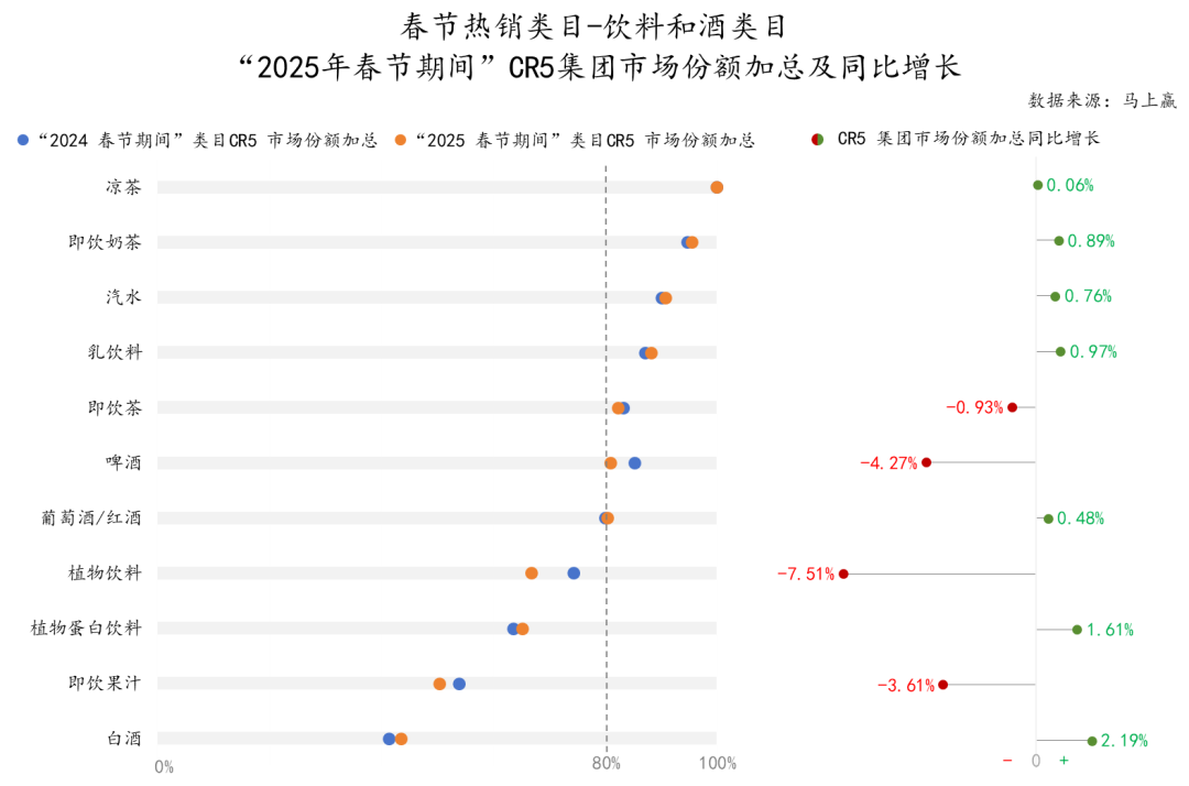 觀察“2025春節(jié)期間”飲料和酒類類目的CR5集團及其市場份額同比變化: