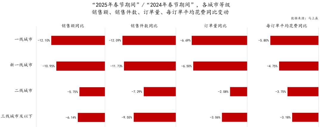 同時,為了確保在兩年春節(jié)消費數(shù)據(jù)對比時樣本池的一致性,本次2025年、2024年的類目訂單數(shù)據(jù)對比中所使用的訂單來源樣本門店均為連續(xù)門店,即該門店自2025年春節(jié)前推14個月均在馬上贏線下零售監(jiān)測網絡當中活躍,2025年與2024年門店樣本池規(guī)模相同。