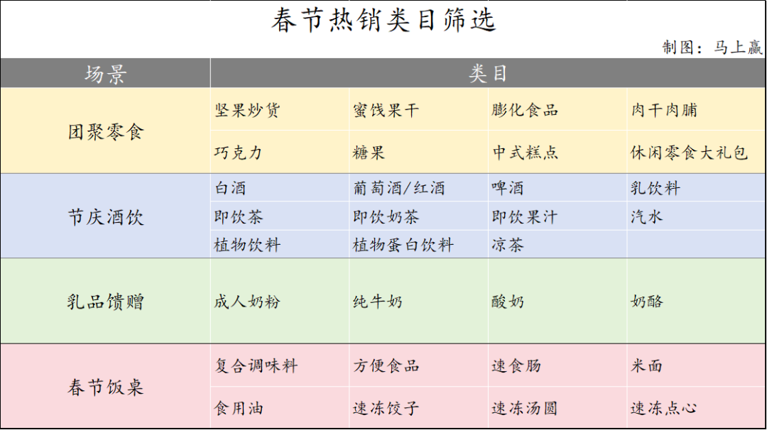 在類目選擇上,我們篩選了線下零售渠道中,與春節(jié)消費場景相關性較高的四個場景合計31個類目,對應的場景與類目分別是: