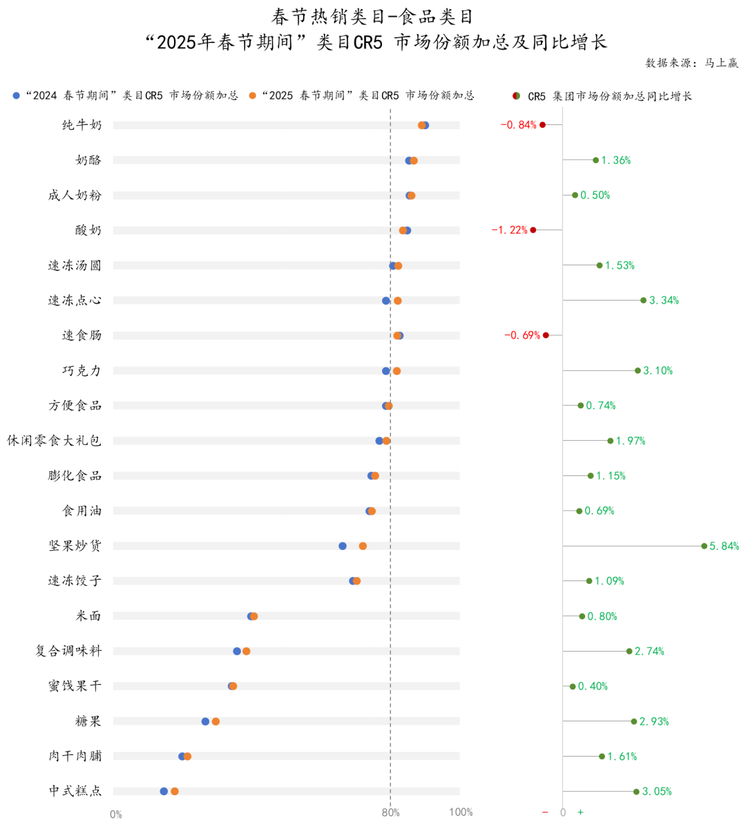 觀察“2025春節(jié)期間”食品類目的CR5集團及其市場份額同比變化: