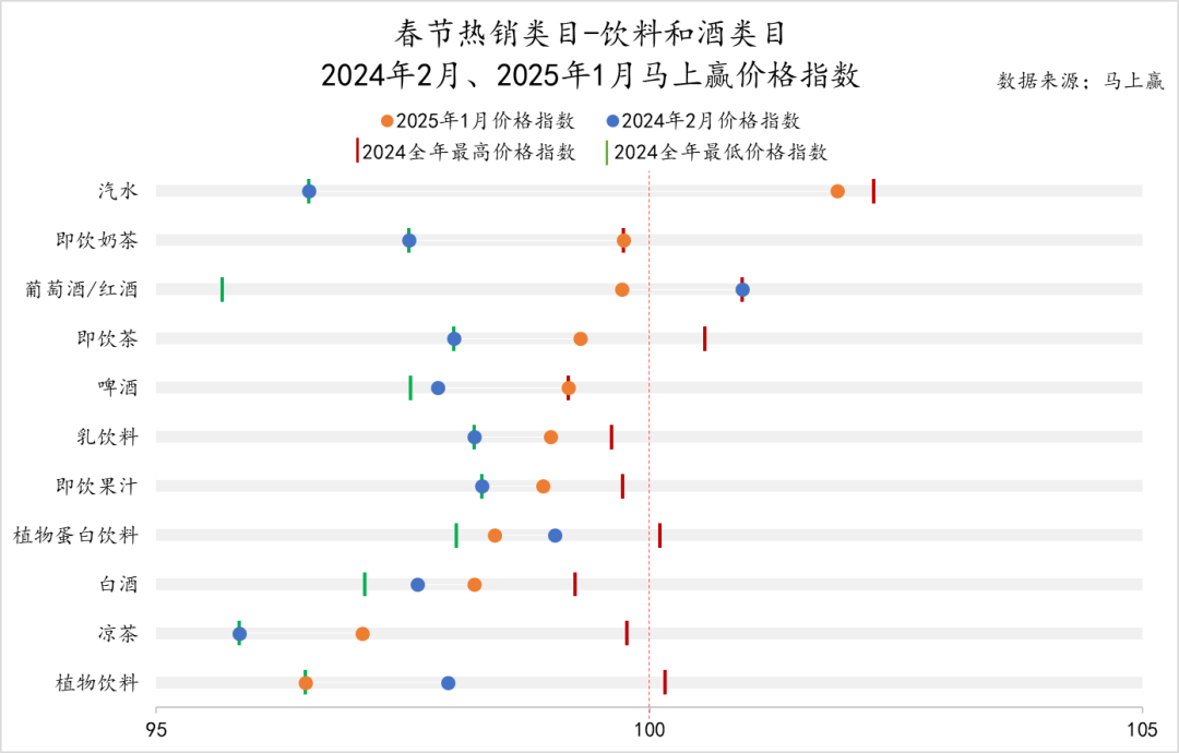 ·在飲料和酒類目中的各春節(jié)熱銷類目中,僅有汽水類目價格指數(shù)高于100,且大幅度超過2024年2月的價格指數(shù)水平,類目的價格增長動力正在回升。其余所有飲料和酒類目,2025年1月價格指數(shù)均低于100,分布于95~100之間,類目價格推動增長的動力整體較弱;