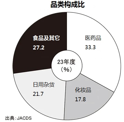 2023年度行業(yè)整體品類構(gòu)成比為四分天下,醫(yī)藥品占33.3%,穩(wěn)固行業(yè)標(biāo)志,化妝品占據(jù)17.8%,日用雜貨占21.7%,食品等其它品類占27.2%。