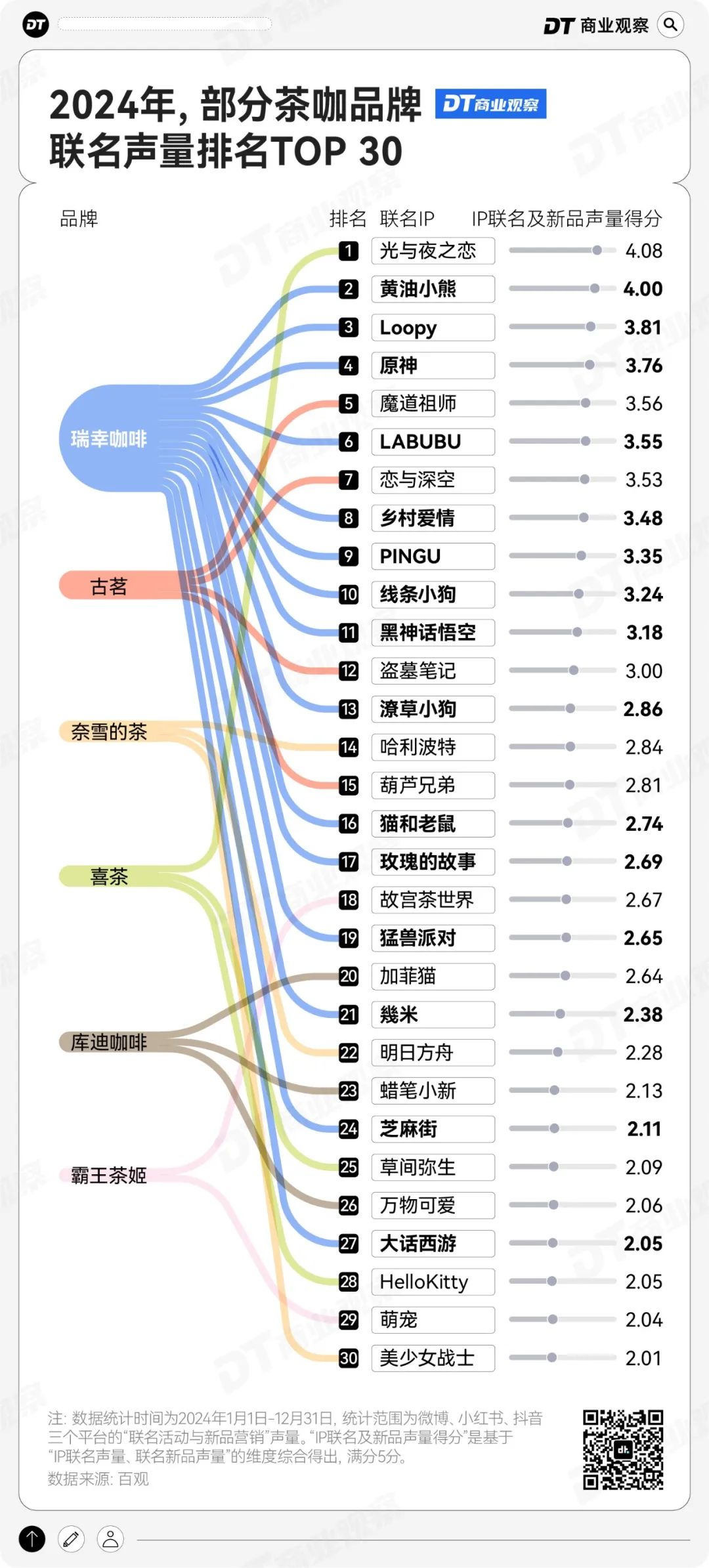 《DT商業(yè)觀察》查看了喜茶、瑞幸咖啡、奈雪的茶、霸王茶姬等12個(gè)主要茶咖品牌的聯(lián)名情況,進(jìn)而發(fā)現(xiàn)——