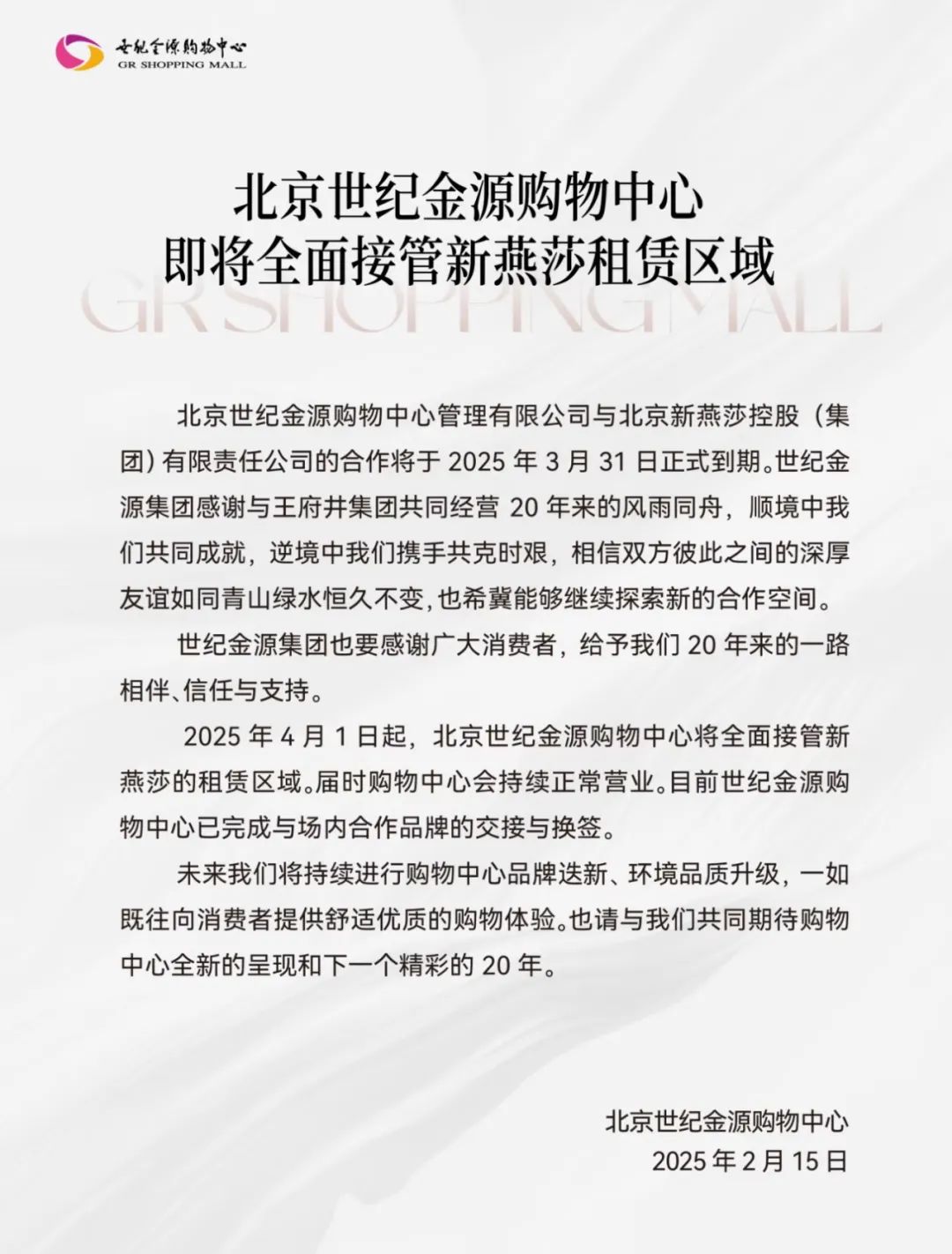 2月14日晚間,王府井集團股份有限公司(以下簡稱“王府井”)發(fā)布公告稱,自2025年4月1日起,北京金源新燕莎MALL、北京燕莎友誼商城金源店及北京貴友大廈金源店將停止經營。