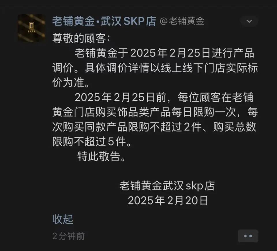 業(yè)績(jī)預(yù)告公布的同時(shí),2月20日,老鋪黃金多家線下店鋪的社交媒體賬號(hào)宣布即將于2月25日進(jìn)行產(chǎn)品調(diào)價(jià)。2月25日前,店鋪還將進(jìn)行限購(gòu),“購(gòu)買飾品類產(chǎn)品每日限購(gòu)一次,每次購(gòu)買同款產(chǎn)品限購(gòu)不超過(guò)2件、購(gòu)買總數(shù)限購(gòu)不超過(guò)5件!
