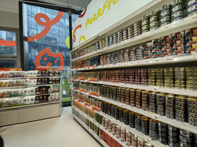 據(jù)了解,店內(nèi)有300+貓狗專用的零食,涵蓋了市場上絕大多數(shù)寵物食品功能小類。休閑零食區(qū)打造了類似專業(yè)零食店的場景,狗狗和貓貓分列兩排,風(fēng)格多樣,價(jià)格實(shí)惠,各種小包裝成為店里的特色。消費(fèi)者到門店里逛逛,可以小份拆零購買,實(shí)現(xiàn)了與電商銷售的差異化,根據(jù)人食趨勢,創(chuàng)新迭代“常買常來常新鮮”。