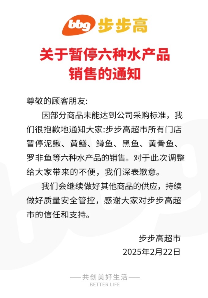 2月22日,步步高發(fā)布關(guān)于暫停六種水產(chǎn)品銷(xiāo)售的通知:因未達(dá)到采購(gòu)標(biāo)準(zhǔn),步步高超市將在所有門(mén)店暫停銷(xiāo)售泥鰍、黃鱔、鱒魚(yú)、黑魚(yú)、黃骨魚(yú)和羅非魚(yú)等六種水產(chǎn)品。
