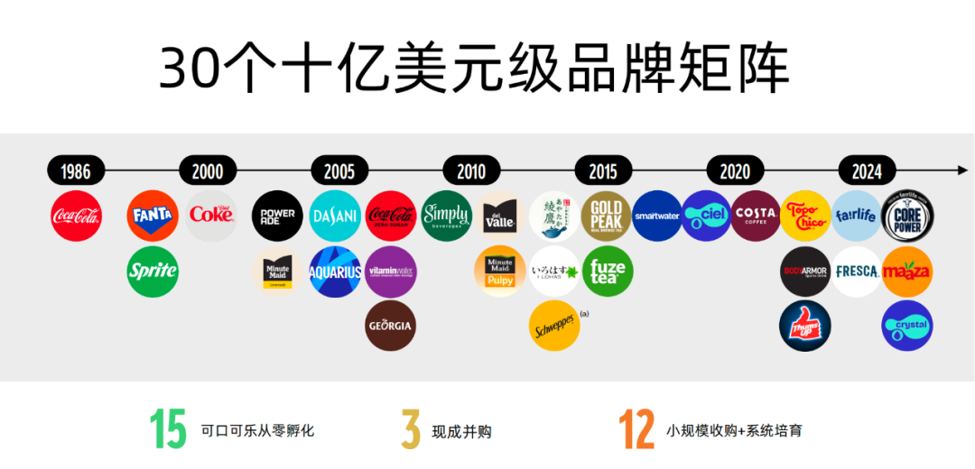 這份品牌勢(shì)能背后,是30個(gè)十億美元級(jí)品牌的版圖。其中15個(gè)是可口可樂“從零孵化”,12個(gè)通過“小規(guī)模收購(gòu)+系統(tǒng)培育”崛起,僅3個(gè)是現(xiàn)成并購(gòu)。詹鯤杰強(qiáng)調(diào)說:“這個(gè)比例體現(xiàn)了我們系統(tǒng)在品牌培育方面的核心能力!
