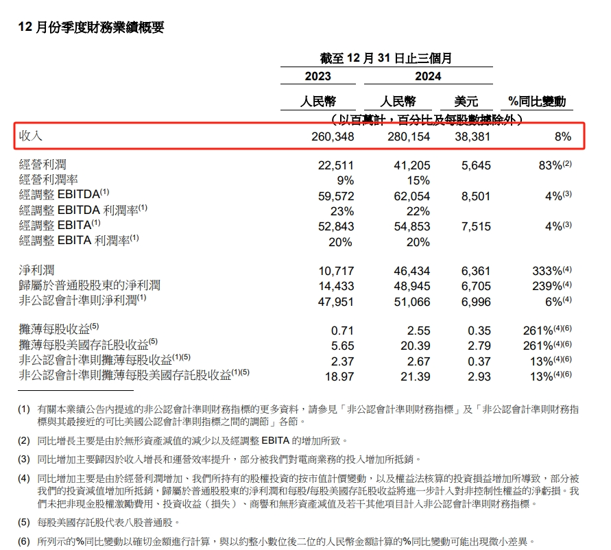 具體而言,阿里巴巴發(fā)布的2025財年第三季度(截至2024年12月)業(yè)績報告顯示,公司總營收達到2801.5億元,同比增長8%,超出市場預(yù)估的2773.7億元;經(jīng)營利潤為412.05億元,同比增長高達83%;