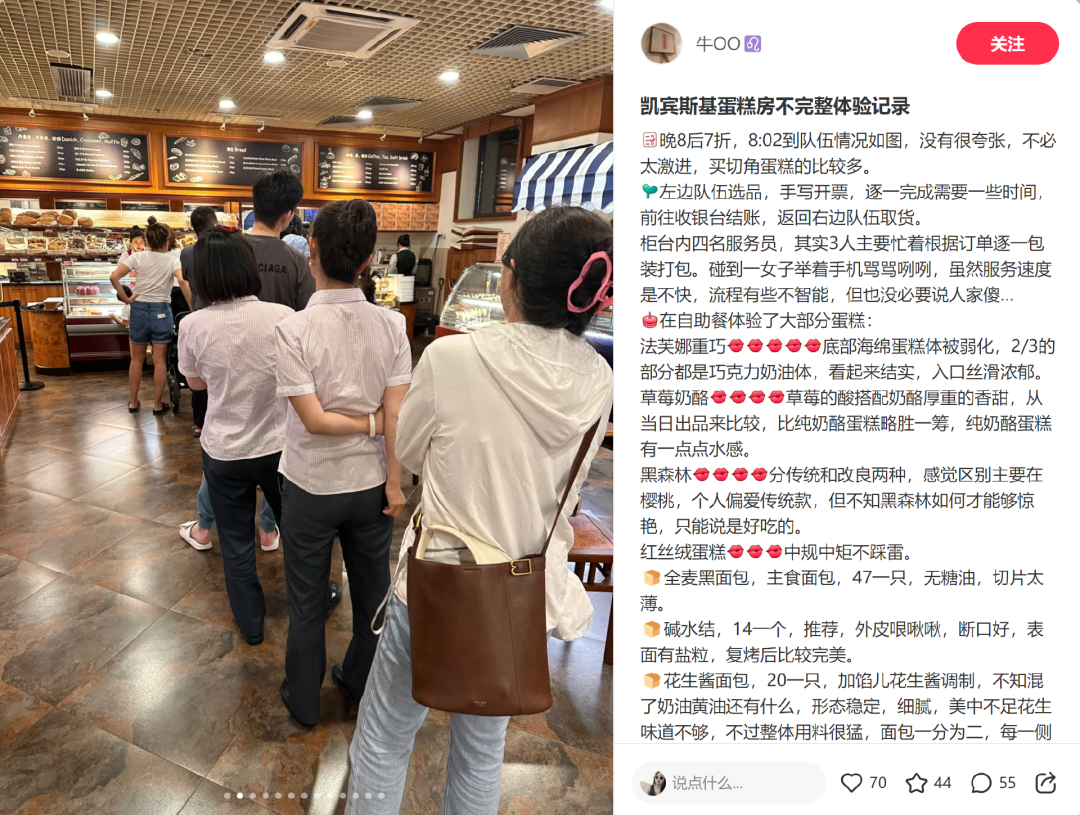 一方面,酒店烘焙的核心競(jìng)爭(zhēng)力在于將“甜品消費(fèi)”升級(jí)為“空間體驗(yàn)”。這種體驗(yàn)經(jīng)濟(jì)與傳統(tǒng)烘焙店“即買即走”的功能性消費(fèi)形成錯(cuò)位,吸引的是追求精致感的客群。另一方面,看重品質(zhì)又面臨消費(fèi)降級(jí)的中產(chǎn)們,則會(huì)是酒店面包和蛋糕等產(chǎn)品的“簇?fù)碚摺薄?/p>
