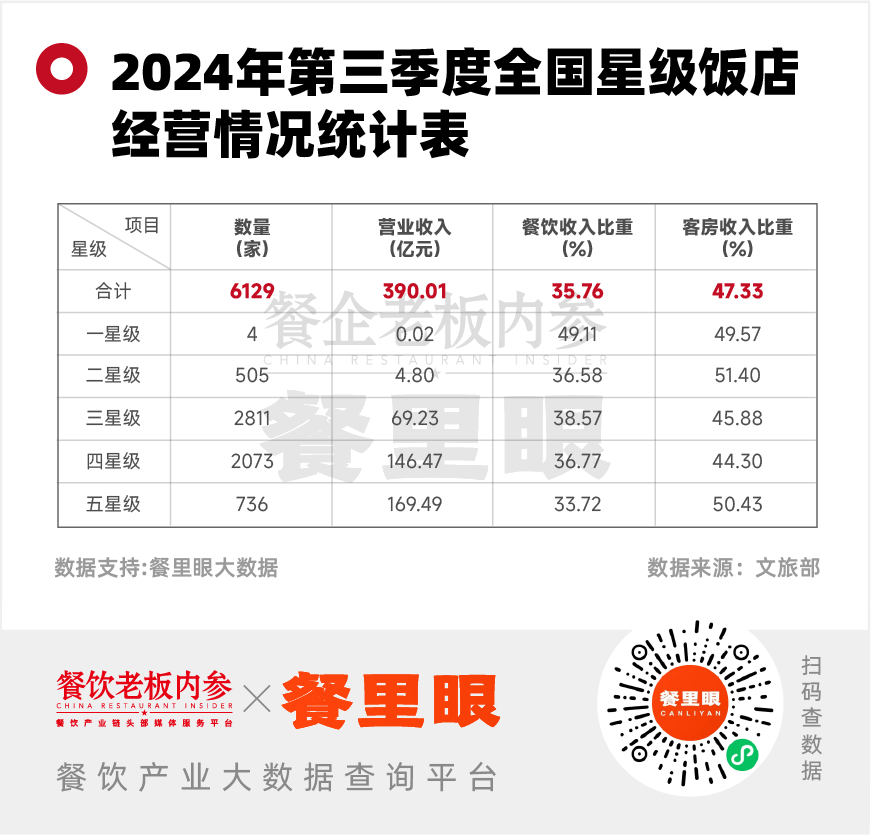 另據(jù)文旅部數(shù)據(jù)顯示,2024年第三季度全國(guó)星級(jí)酒店餐飲收入占比是35.76%,其中一星級(jí)酒店餐飲收入占比最高,接近半成(49.11%)。