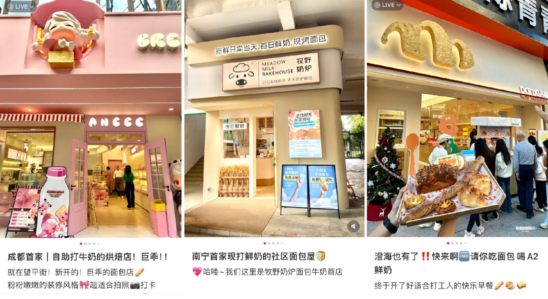 早在2022年,北京的網(wǎng)紅烘焙店“紅星前進面包牛奶公司”憑借“現(xiàn)烤面包+現(xiàn)打牛奶”的創(chuàng)新模式迅速走紅,成為社交平臺上的打卡熱點,消費者被新鮮、現(xiàn)制的體驗所吸引。