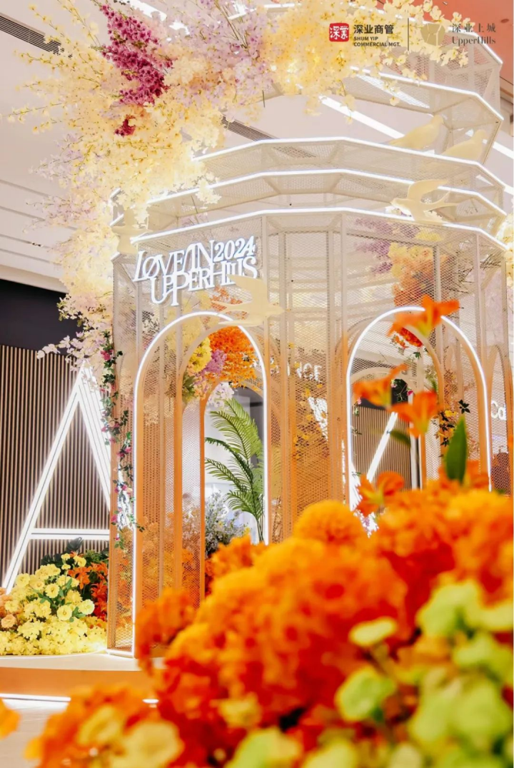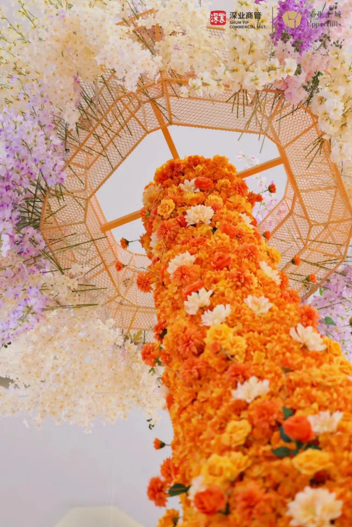 深業(yè)上城2024年策劃了一場SEASON OF BLOSSOM主題季活動。其整體的美陳裝置以清新明亮的花卉為主,在商場中庭位置放置了一個活動空間,讓兒童和顧客等可流連其中,身臨其境。
