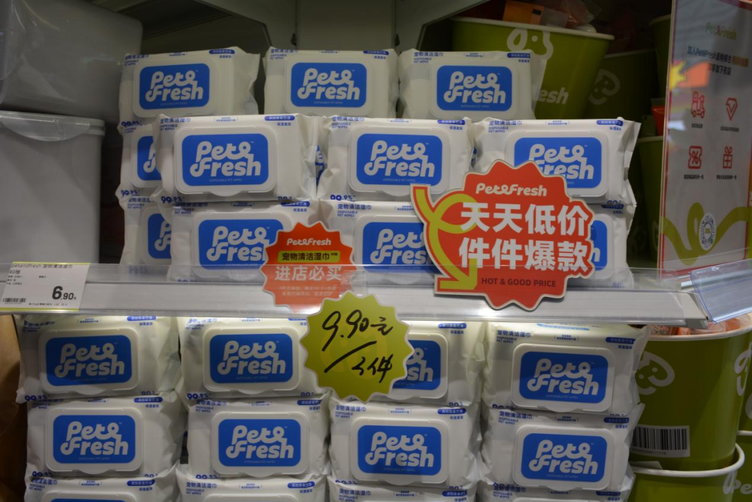 在現(xiàn)場也可以看到,寵物商品的確較為實惠。比如9.9元三包的寵物濕巾、6.6元的進口雞胸肉罐頭、9.9元10個的貓條、9.9元2.5公斤的混合豆腐貓砂等,并將長期維持該價格。這種價格機制,不僅在線下門店中極具競爭力,對線上電商也有沖擊力。