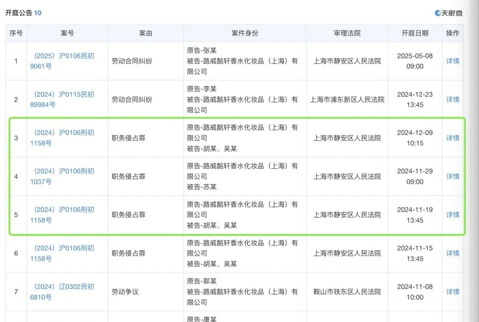 綜合天眼查信息,“(2024)滬0106刑初1037號”和“(2024)滬0106刑初1158號”涉及的“某A有限公司”,正是路威酩軒香水化妝品(上海)有限公司(后簡稱“路威酩軒香化”)。