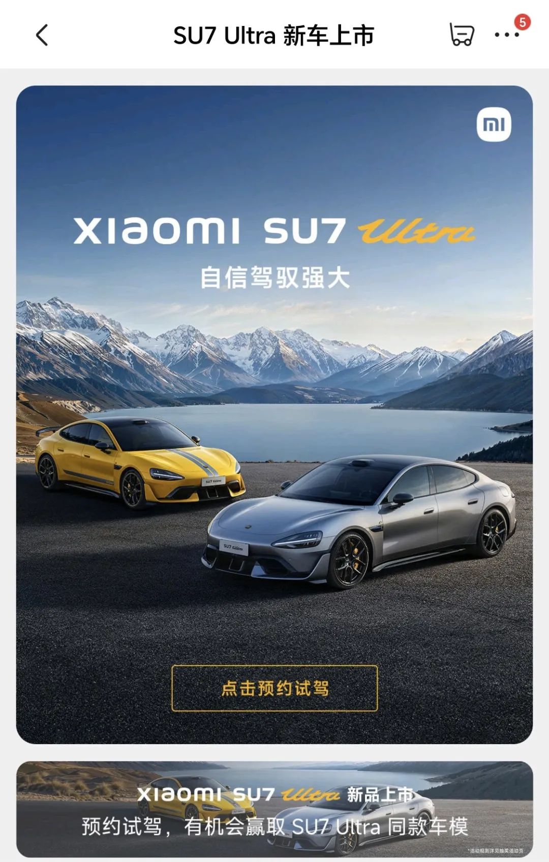 值得注意的是,小米汽車在入駐京東的同時(shí),其天貓官方旗艦店也正式上線運(yùn)營,小米SU7 Ultra也同步開啟了預(yù)售試駕活動(dòng)。
