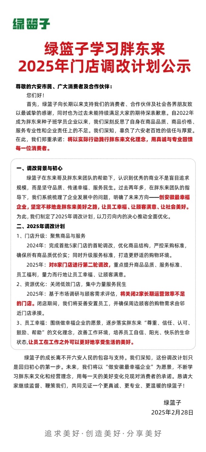 綠籃子的成長離不開六安人民的包容與支持。這份調改計劃只是綠籃子回歸初心的第一步。未來,綠籃子將以“做安徽最幸福企業(yè)”為愿景,不斷學習胖東來文化和經(jīng)營理念,用每一天的美好變化兌現(xiàn)對消費者的承諾。綠籃子也懇請消費者繼續(xù)監(jiān)督和鞭策,共同見證一個更真誠、更專業(yè)、更溫暖的綠籃子!