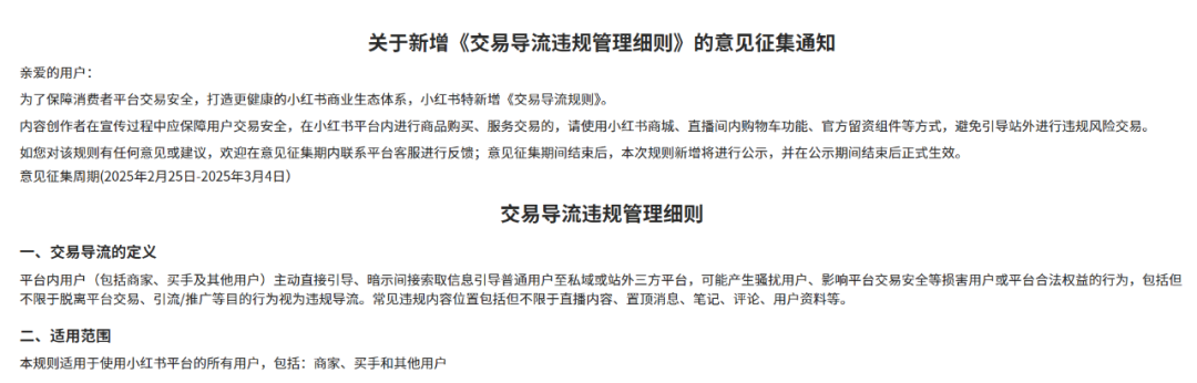 緊隨其后,小紅書(shū)也發(fā)布了《交易導(dǎo)流違規(guī)管理細(xì)則》的意見(jiàn)征集通知,將管控范圍從商家擴(kuò)展至所有用戶,包括買手及普通用戶。