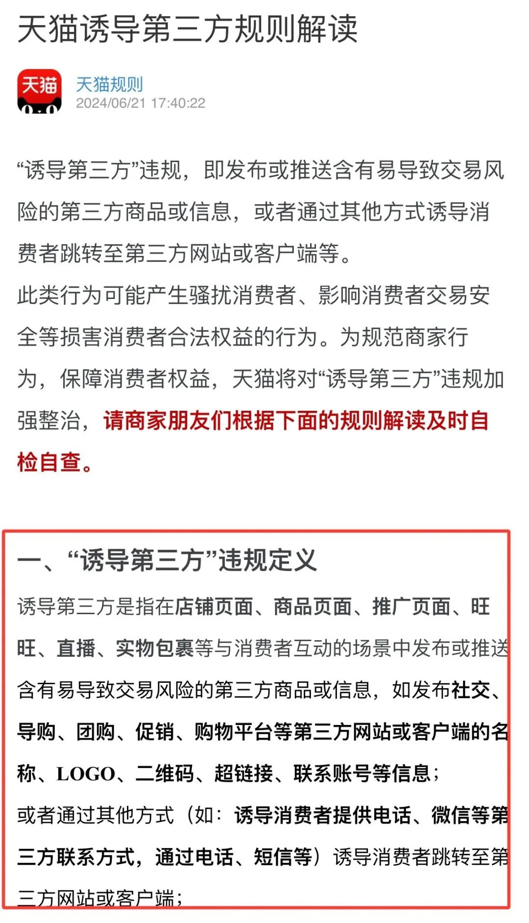 例如,在2024年6月,天貓?jiān)抻喴?guī)則,明確禁止商家通過(guò)包裹卡片、客服對(duì)話等方式向微信等第三方平臺(tái)導(dǎo)流,違規(guī)者將面臨商品下架、扣分甚至清退等嚴(yán)厲處罰。