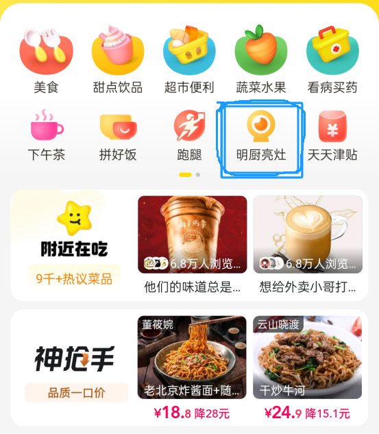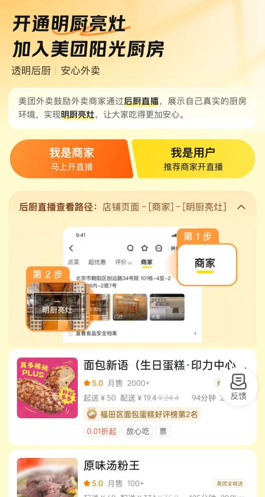 目前,“美團外賣”已在首頁顯著位置上線“明廚亮灶”專區(qū),點進即可選擇“我是商家,馬上開直播”或“我是用戶,推薦商家開直播”。