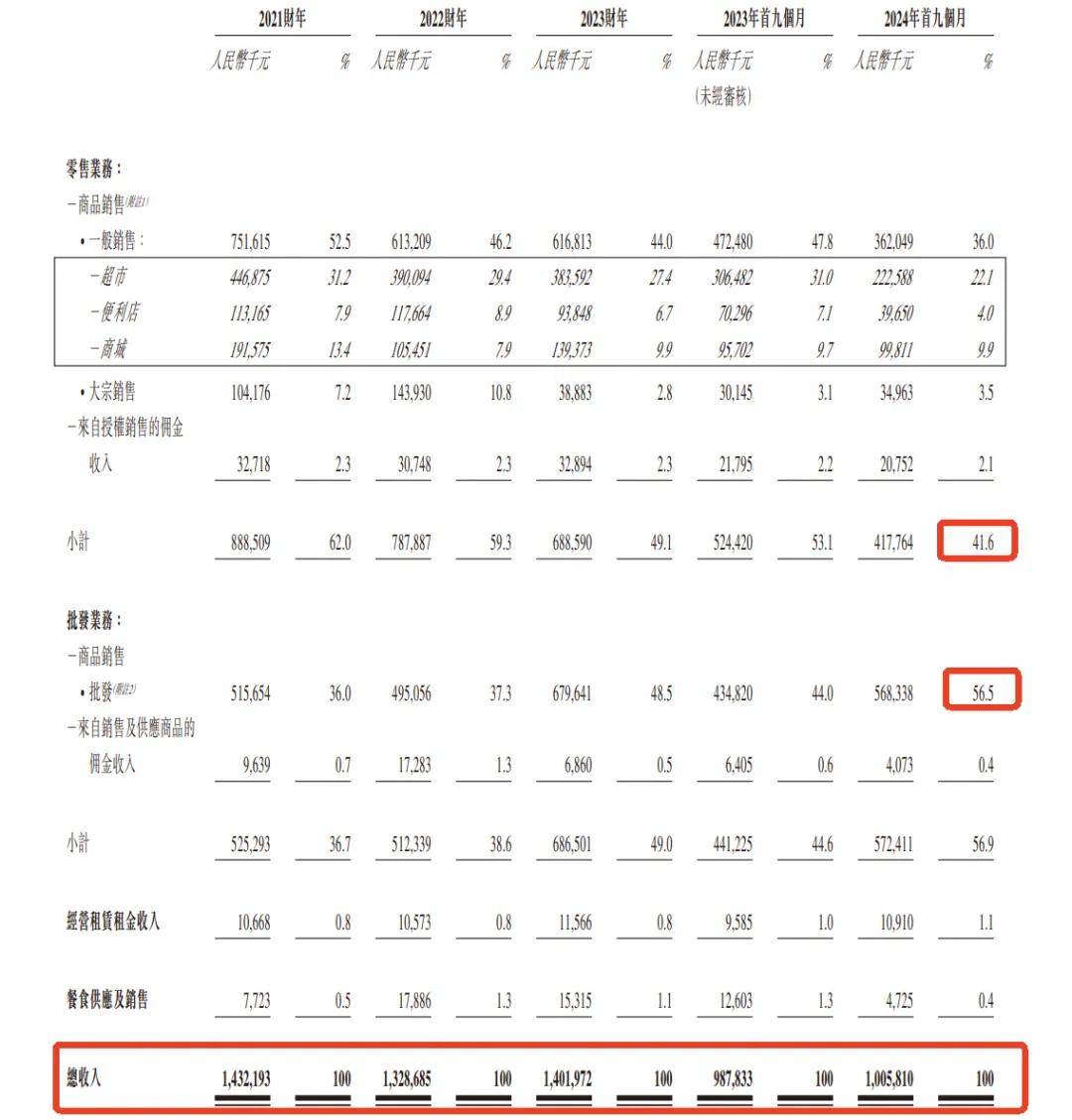 招股書揭開了其超市外衣下的另一面:2021年、2022年、2023年及2024年前九個月,宏信超市零售業(yè)務產(chǎn)生的收入約為8.89億元、7.88億元、6.89億元及4.18億元,占總收入的62.0%、59.3%、49.1%及41.6%;與此相對,批發(fā)業(yè)務收入占比則一路走高,同期分別為5.25億元、5.12億元、6.87億元及5.72億元,占總收入的36.7%、38.6%、49.0%及56.9%,已經(jīng)完成對零售業(yè)務的反超。