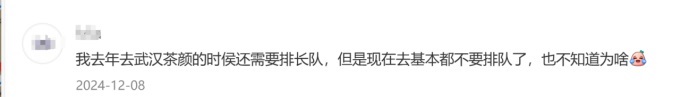 以武漢為例,一位博主發(fā)布了題為《為啥武漢的茶顏悅色沒人排隊(duì)》的筆記,收獲了1318個(gè)點(diǎn)贊與眾多認(rèn)同。筆記中提到:“我出差去武漢天地打卡茶顏悅色,無需排隊(duì),直接就能購(gòu)買,再到另一家茶顏悅色門店,同樣也沒有排隊(duì)現(xiàn)象。”