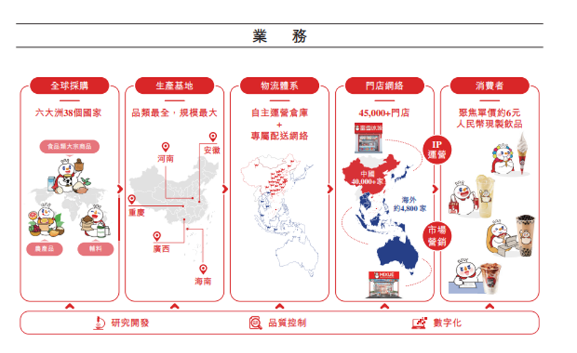 招股書中提到,當前,蜜雪冰城已打造了中國現(xiàn)制飲品行業(yè)內(nèi)規(guī)模最大的、高度數(shù)字化的完整端到端供應鏈體系,覆蓋采購、生產(chǎn)、物流、研發(fā)及品質(zhì)控制等關(guān)鍵環(huán)節(jié)。