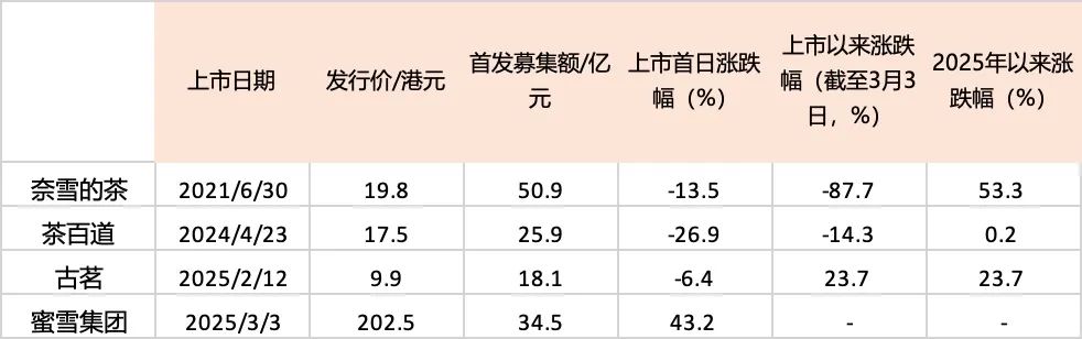 市場(chǎng)波動(dòng),疊加同業(yè)奈雪的茶、茶百道、古茗上市首日破發(fā)的「魔咒」,或讓蜜雪冰城謹(jǐn)慎調(diào)整了上市估值定價(jià)和發(fā)行規(guī)模。