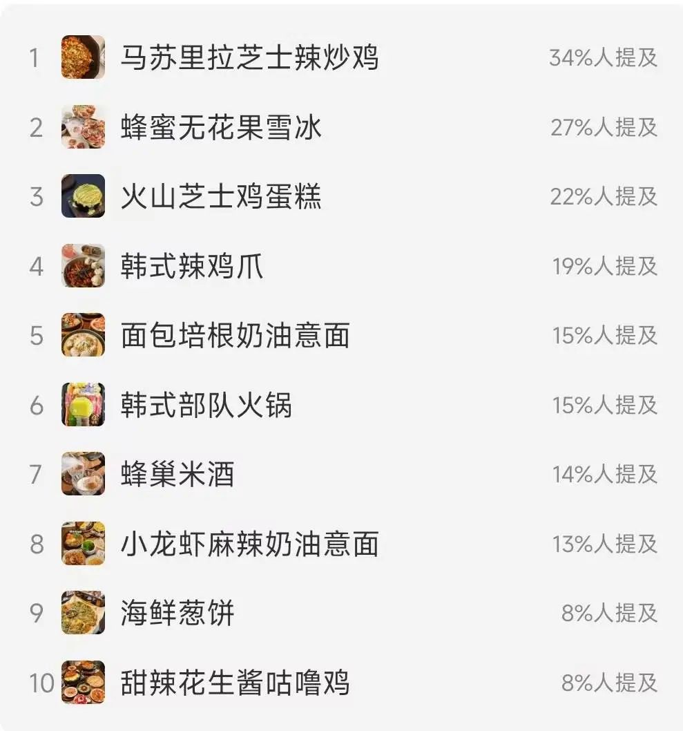 在小紅書(shū)平臺(tái),馬蘇里拉芝士辣炒雞、蜂蜜無(wú)花果雪冰、火山芝士蛋糕等創(chuàng)意菜品受到網(wǎng)友熱捧。馬蘇里拉芝士辣炒雞的熱度最高,有34%網(wǎng)友在韓式創(chuàng)意料理的相關(guān)帖子中都提到了該菜品。