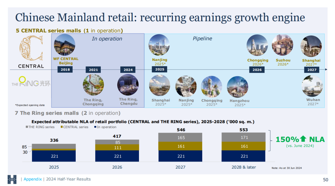 從目前香港置地在內(nèi)地的商業(yè)布局來看,“光環(huán)”系列商業(yè)是拓展比較快的,“中環(huán)”的布局相對審慎,目前只有2018年開業(yè)的北京王府中環(huán)一個(gè)在運(yùn)營的商業(yè)項(xiàng)目。
