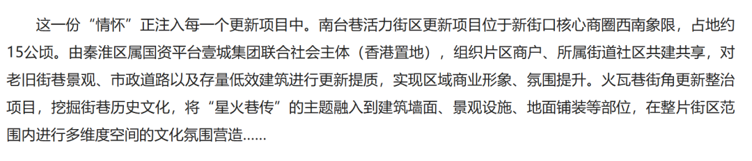 由于項(xiàng)目地處新街口西南象限,2023年香港置地同時(shí)參與了由秦淮區(qū)政府牽頭的朝天宮街道”新街口南臺巷活力街區(qū)更新項(xiàng)目“。