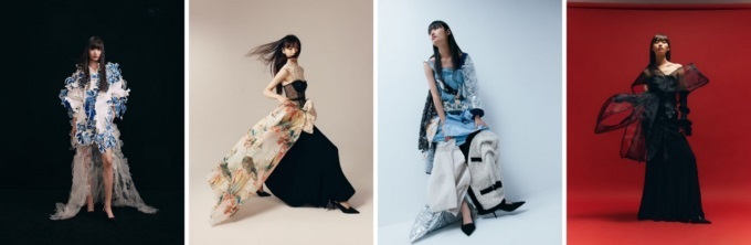 兼具時尚與可持續(xù)性的獲獎作品(從左到右依次為《活態(tài)詩學(xué)·虛實(shí)青韻》-黃斯赟、《The Impossible Wardrobe》-林明锜、《Alight》-馬瀅兒、《Black Mirage》-王芷涵)