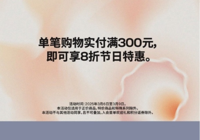 為慶祝國際婦女節(jié),H&M特別推出了一系列節(jié)日特惠活動。3月6日至9日,顧客在H&M線下門店及網(wǎng)上商店(hm.com)單筆購物滿300元,即可享受8折優(yōu)惠。同時,H&M天貓、京東、拼多多、抖音官方旗艦店也將同步推出滿減直降等節(jié)日特惠禮遇,為女性消費(fèi)者帶來更多驚喜與福利。