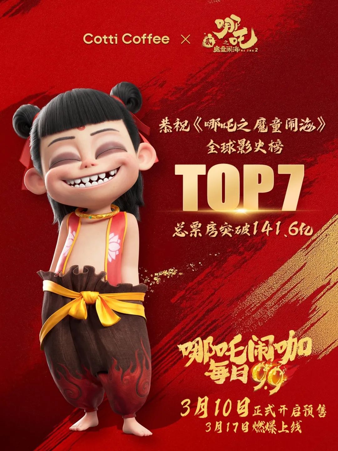 2月27日,庫迪咖啡官宣與《哪吒2》達成現(xiàn)制咖啡領域獨家聯(lián)名合作。作為進入全球票房前7和首部票房超20億美元的亞洲電影,《哪吒2》與庫迪咖啡達成合作,這既是雙方對年輕消費心理的精準洞察,亦是國漫IP從銀幕走向消費生活的破圈宣言。