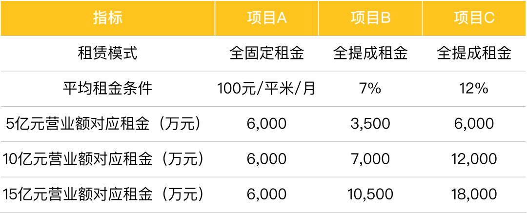 可以發(fā)現(xiàn),同樣的營業(yè)額并沒有產(chǎn)生相同的營業(yè)收入,甚至出現(xiàn)了營業(yè)額達到15億元的商場B,收入還沒有營業(yè)額10億元的商場C來得高這樣的倒掛現(xiàn)象。