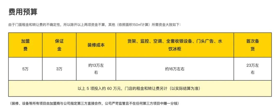 以零食很忙官網(wǎng)公布的加盟費(fèi)用預(yù)算顯示,一家150平米的門店,投入成本需要60萬元左右,但這個數(shù)字剔除了店面租金和轉(zhuǎn)讓成本,如果加盟商所處地段租金水平較高,即使算上加盟費(fèi)減免的優(yōu)惠,前期加盟商投入的總成本也需要大約75-90萬元。