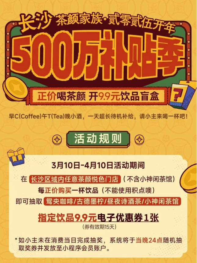 活動采用消費(fèi)抽獎的形式發(fā)放優(yōu)惠券,消費(fèi)者每在在長沙地區(qū)的茶顏門店(不包括茶館),每正價喝一杯茶顏作品(包括外賣),就可以參與一次線上抽獎,并隨機(jī)獲得一張9.9元喝茶顏家族子品牌專屬作品的優(yōu)惠券。若消費(fèi)者消費(fèi)后未進(jìn)行抽獎,系統(tǒng)也會在當(dāng)天將優(yōu)惠券發(fā)放至消費(fèi)者賬戶中。