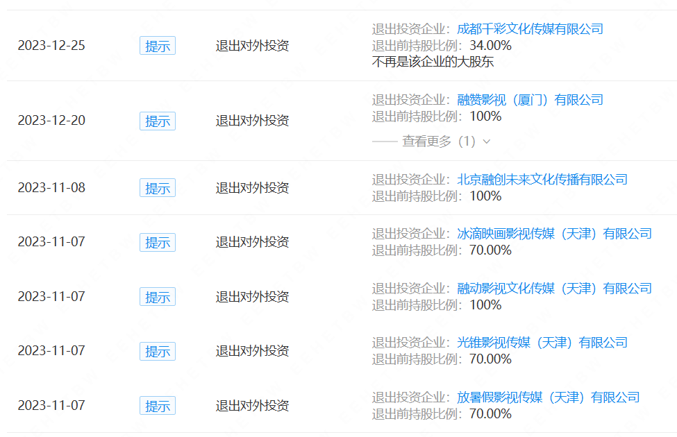 ▲融創(chuàng)未來影視文化傳媒(北京)有限公司退出多起投資。圖片來自企查查。