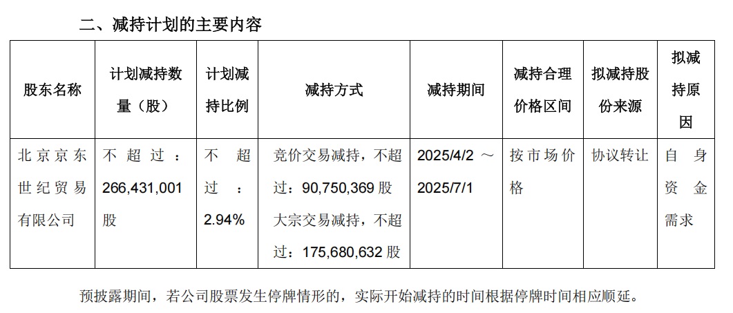根據(jù)公告,京東世貿(mào)擬通過(guò)集中競(jìng)價(jià)交易方式減持不超過(guò)9075萬(wàn)股,通過(guò)大宗交易方式減持不超過(guò)1.76億股。減持期間為2025/4/2-2025/7/1這3個(gè)月內(nèi)。
