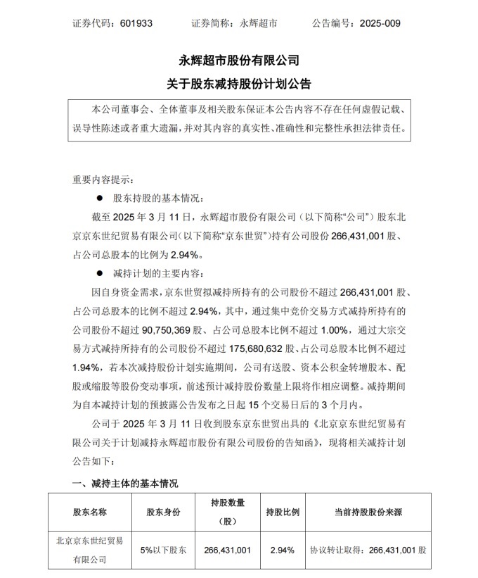 3月11日,永輝超市發(fā)布股東減持股份計(jì)劃的公告,因自身資金需求,其股東北京京東世紀(jì)貿(mào)易有限公司(以下簡(jiǎn)稱(chēng)京東世貿(mào))擬減持所持有的永輝超市股份不超過(guò)2.66億股、占永輝超市總股本的比例不超過(guò)2.94%。