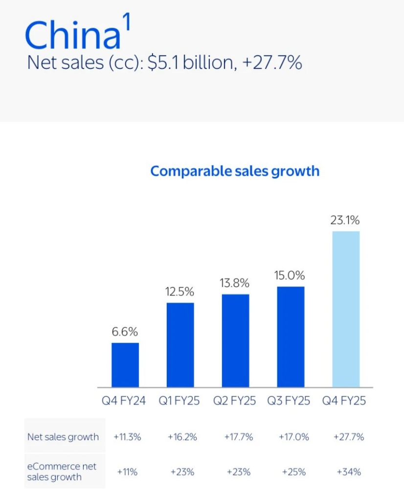 在中國市場,沃爾瑪表現(xiàn)出色,年度凈銷售額規(guī)模約為203億美元。第四季度,沃爾瑪中國凈銷售額攀升至51億美元,同比增長27.7%,可比銷售額增長率達(dá)到23.1%。其中,電商業(yè)務(wù)同比增長達(dá)34%。
